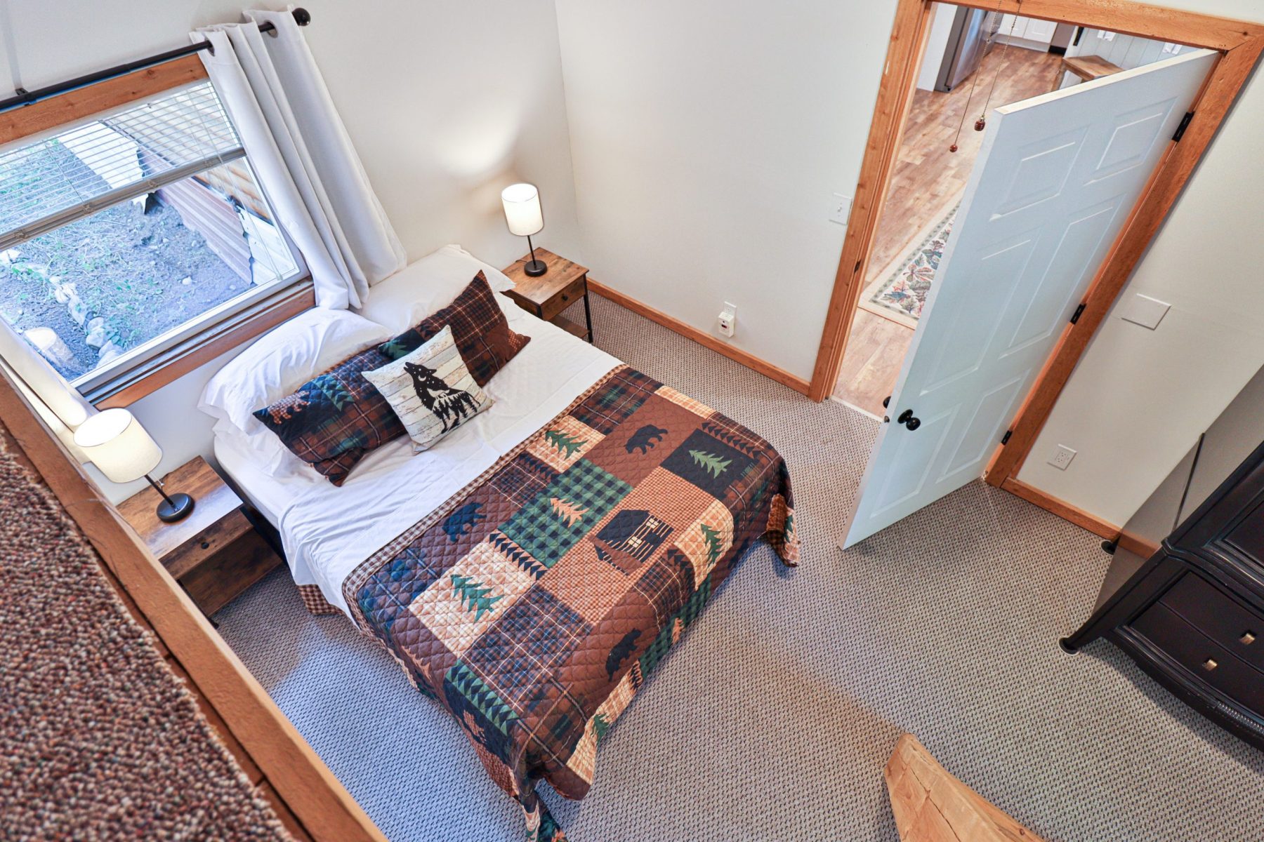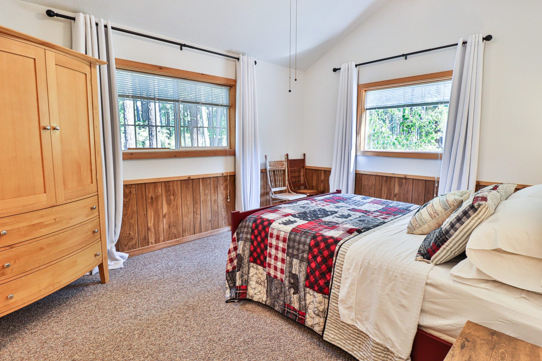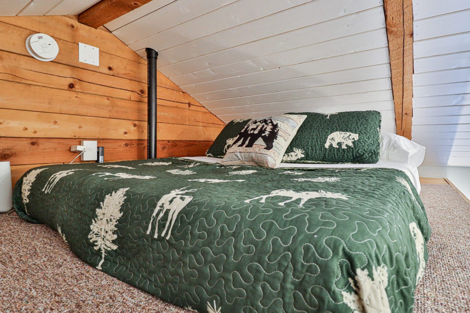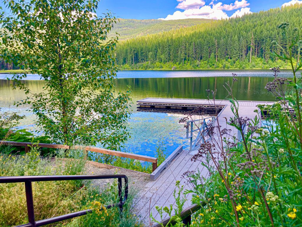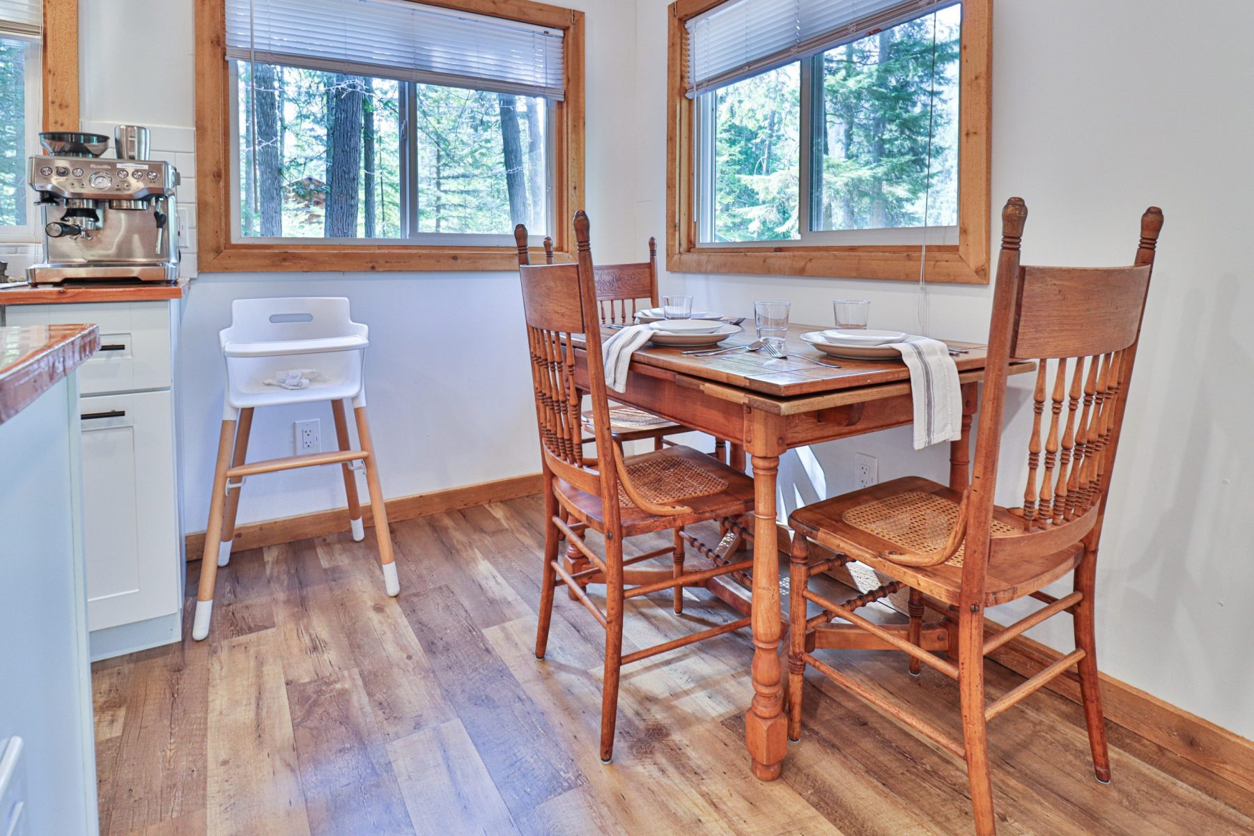 The Moyie River Hideaway is a newly-renovated river-front 1,200 sq ft cabin with 2 bedrooms, 2 bathrooms, a sleeping loft and queen murphy bed that sleeps up to 8. A fully-equipped kitchen, Traeger grill, washer and dryer, wood stove, fire pit, fenced yard, outdoor deck, Smart TV, and dedicated workspace make this comfortable for the entire family for an extended stay.