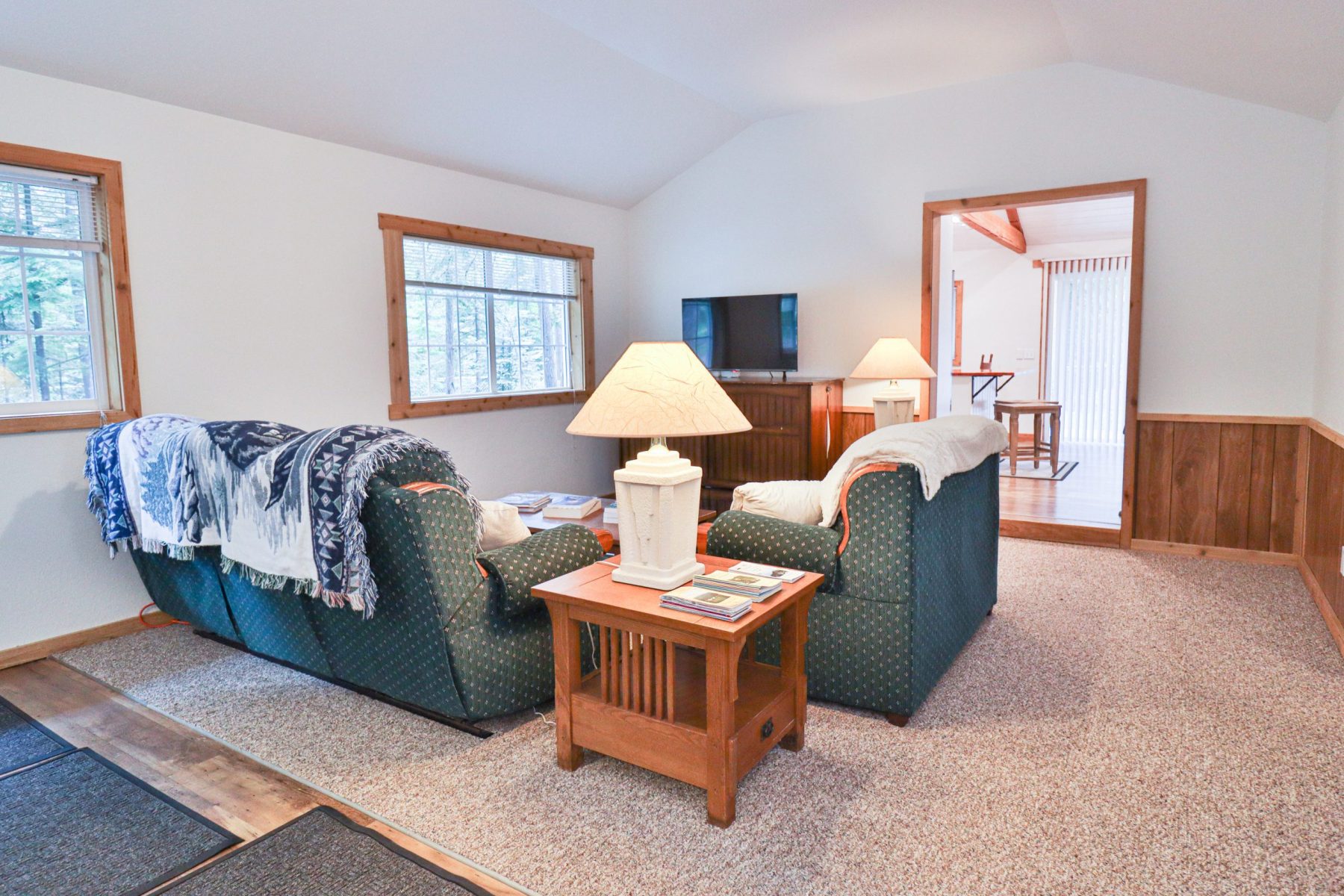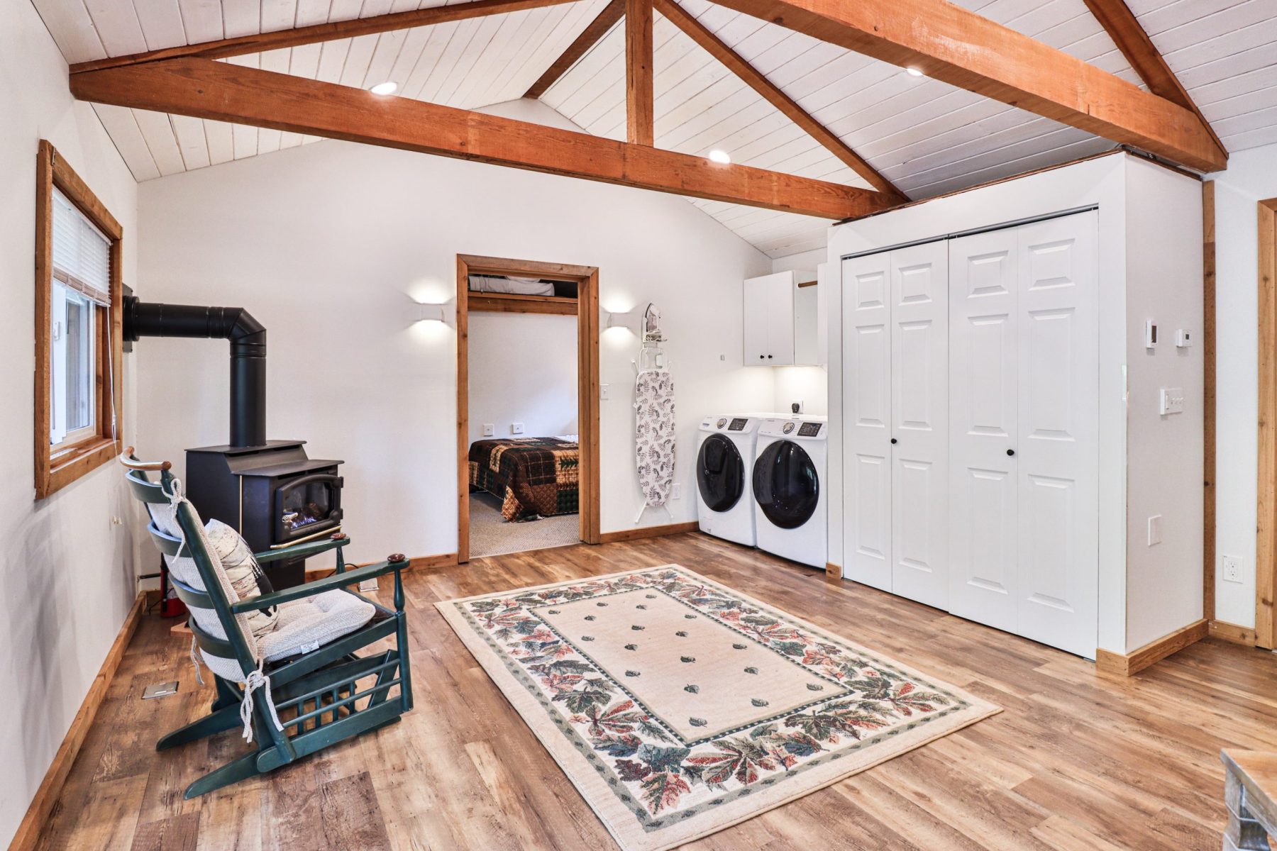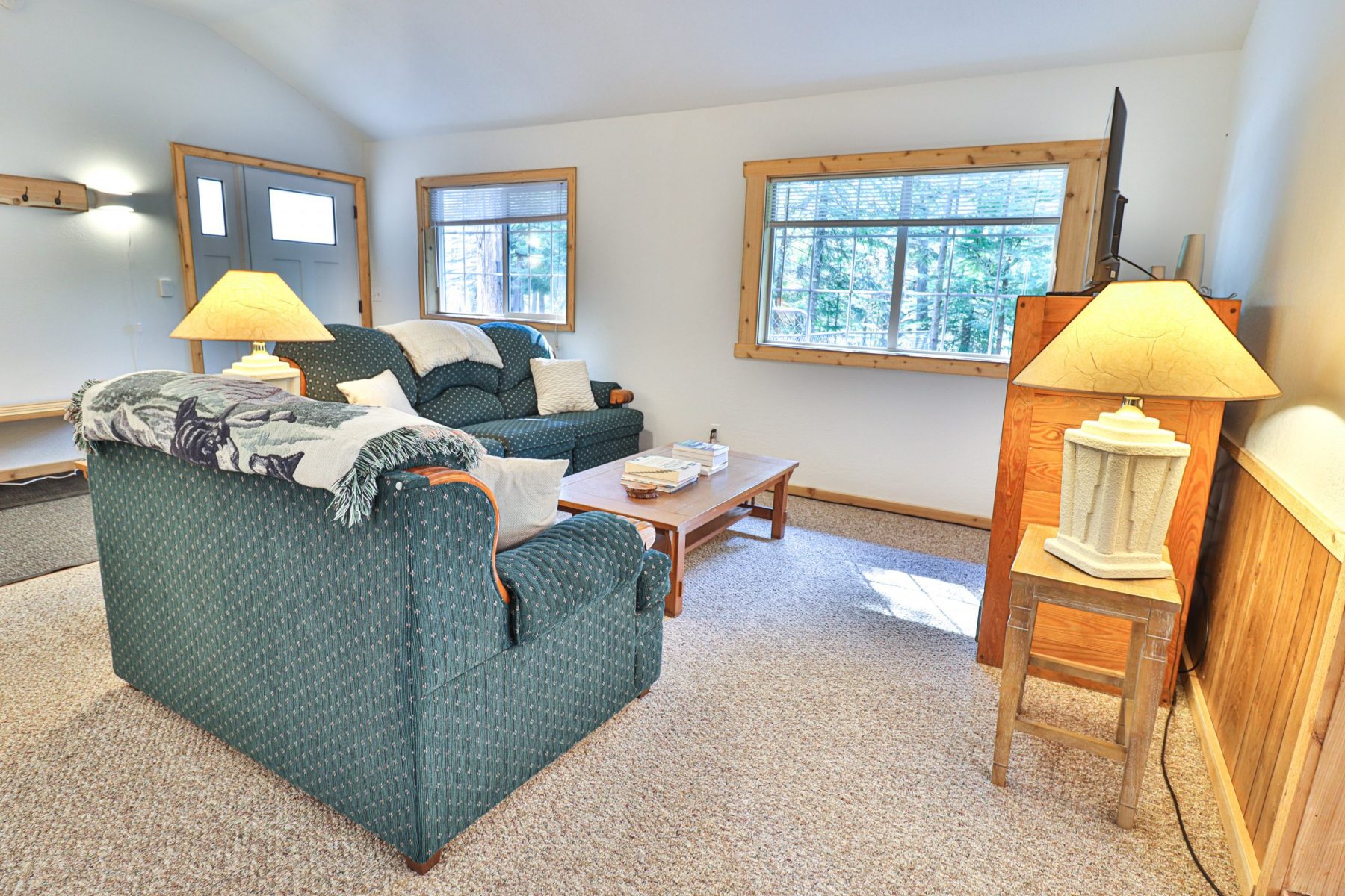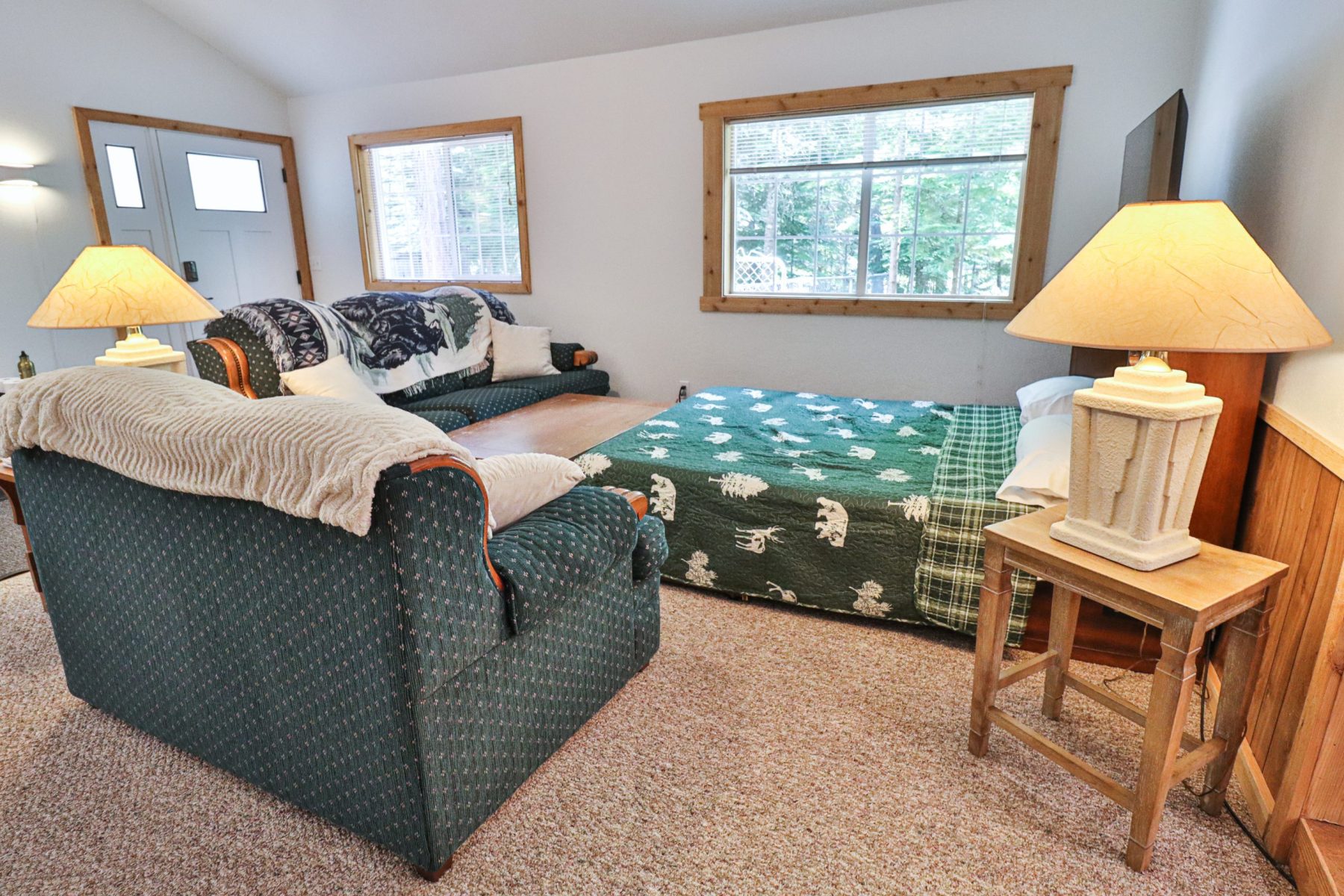 The Moyie River Hideaway is a newly-renovated river-front 1,200 sq ft cabin with 2 bedrooms, 2 bathrooms, a sleeping loft and queen murphy bed that sleeps up to 8. A fully-equipped kitchen, Traeger grill, washer and dryer, wood stove, fire pit, fenced yard, outdoor deck, Smart TV, and dedicated workspace make this comfortable for the entire family for an extended stay.