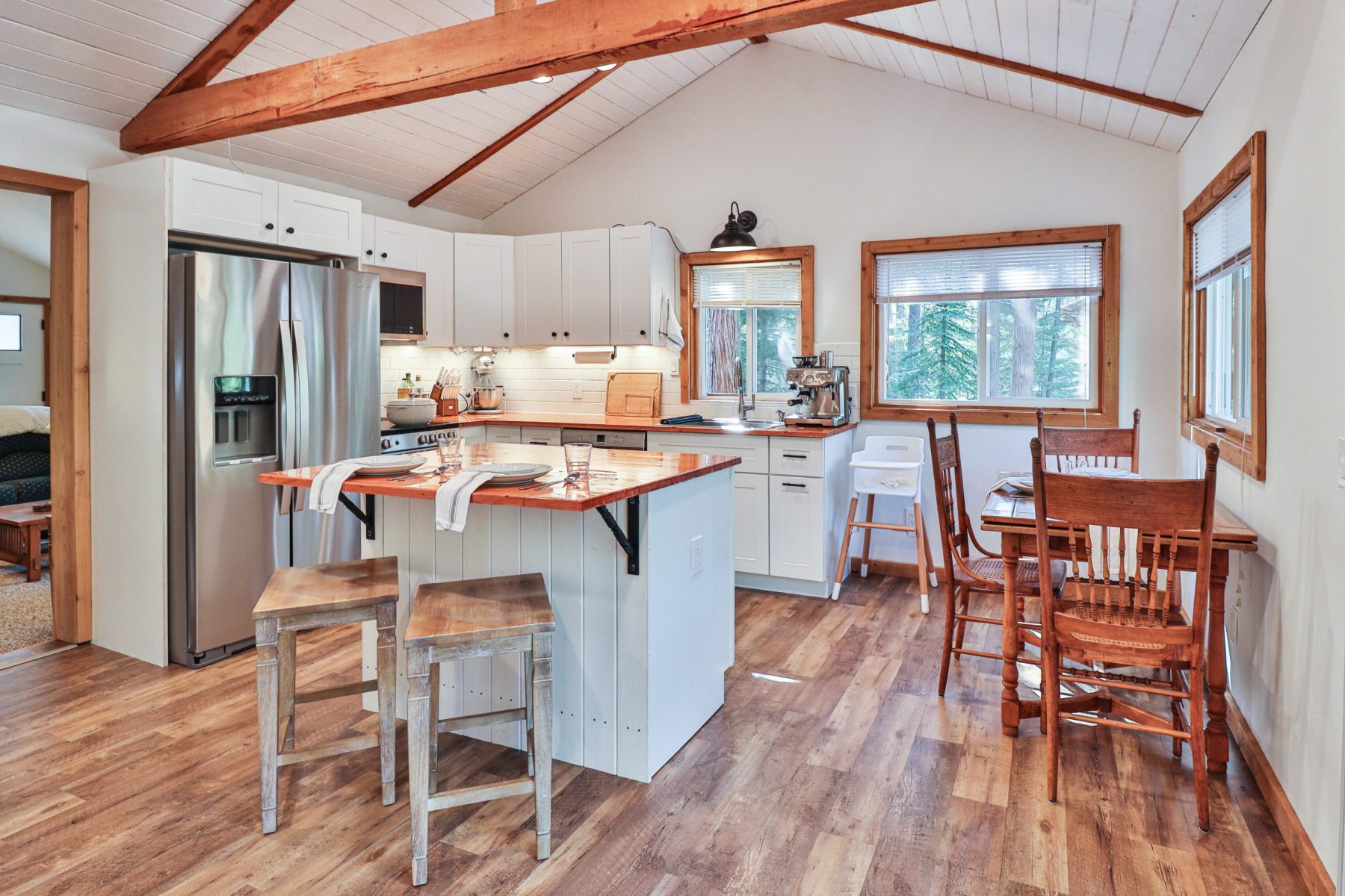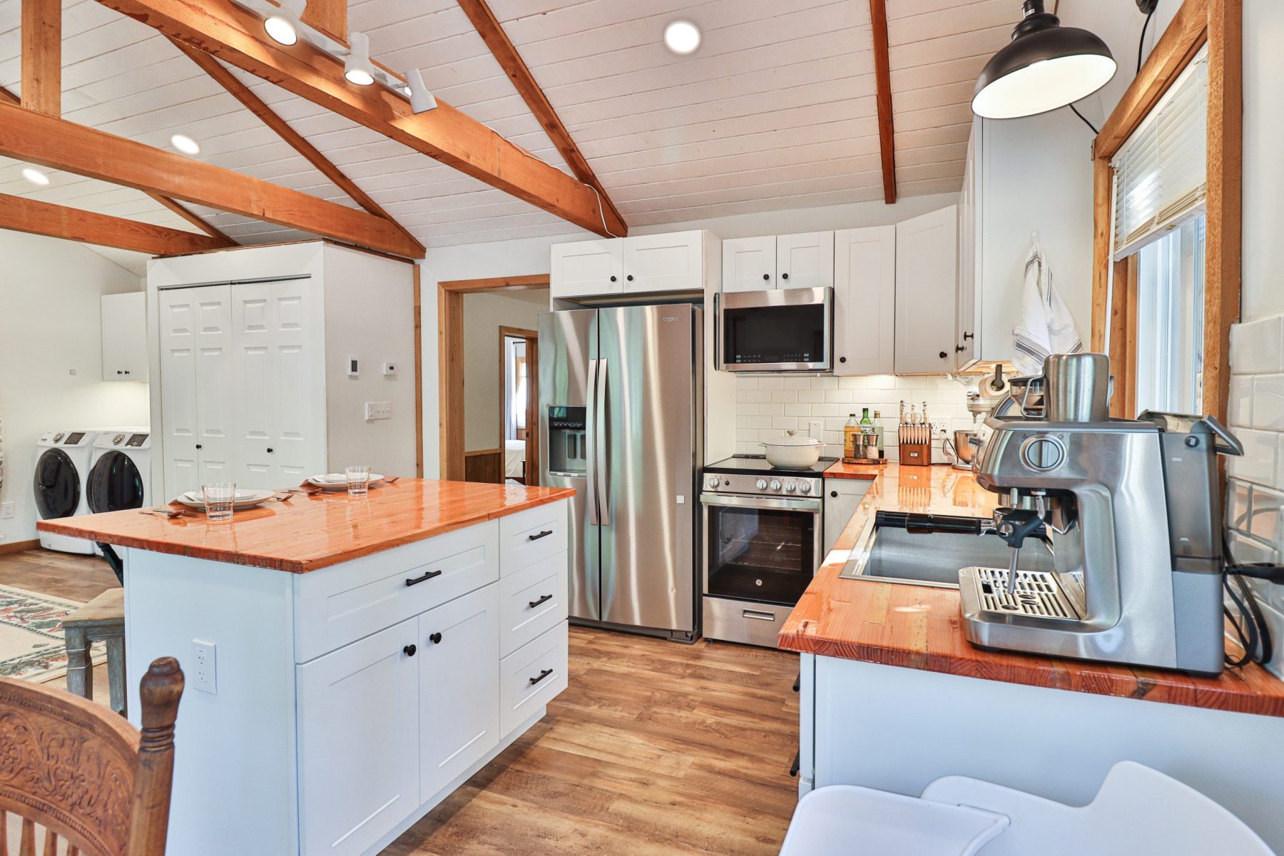 - Fully equipped kitchen: stainless steel appliances, refrigerator, ice maker, water filter, microwave, stove, oven, dishwasher, coffee maker, Crockpot, blender, toaster, dishware/flatware, cookware, island, expandable dining table seats up to 6, high chair