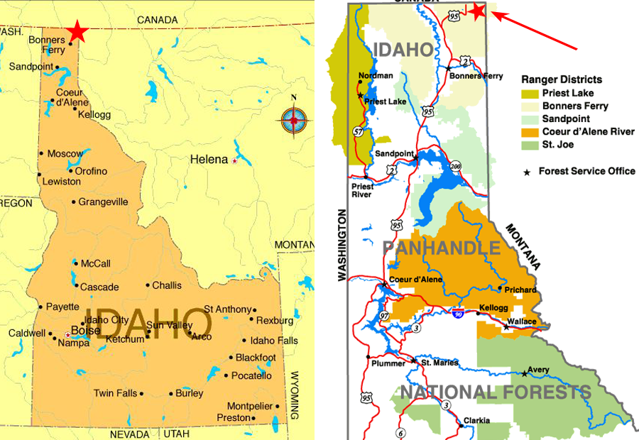 The Moyie River Hideaway is located just 30 miles North of Bonners Ferry, ID on HWY 95, one mile from the Canadian border at Eastport. This Bonners Ferry cabin rental has immediate access to public land (Kaniksu National Forest) and from there can connect to Kootenai National Forest in Montana.